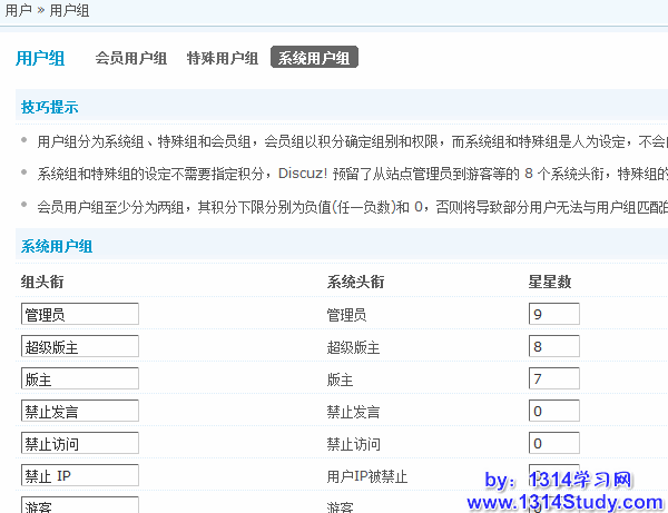 在这里,可以修改几个默认的系统用户组的名称与星星数目等,同样,点击详情可以看到用户组的具体设置。