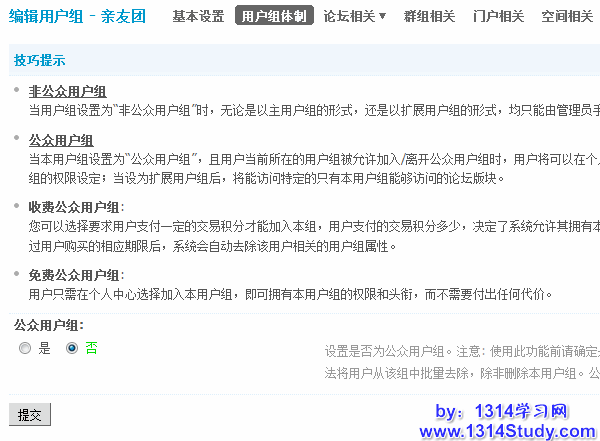 1)公众用户组:设置是否为公众用户组。注意: 使用此功能前请确定是否确实需要,否则用户一旦自行加入本组,即便之后再设置本组为非公众用户组,仍然无法将用户从该组中批量去除,除非删除本用户组。公众用户组不能关联管理组,以免产生安全隐患。