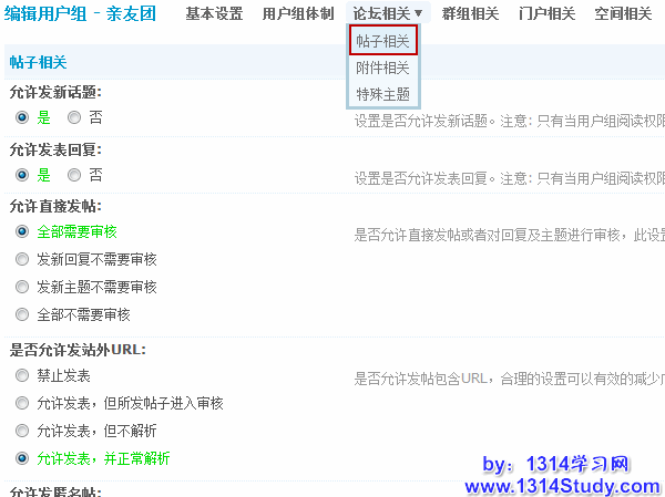 4)是否允许发站外URL:是否允许发帖包含URL,合理的设置可以有效的减少广告帖的量。