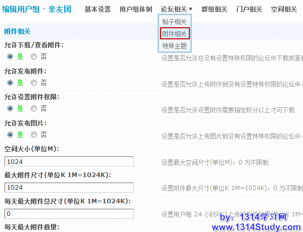7)每天最大附件总尺寸(单位K 1M=1024K):设置用户上传的每天总附件的总尺寸。