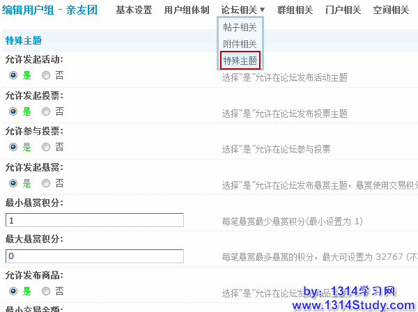 4)允许发起悬赏:选择“是”允许在论坛发布悬赏主题,悬赏使用交易积分。
