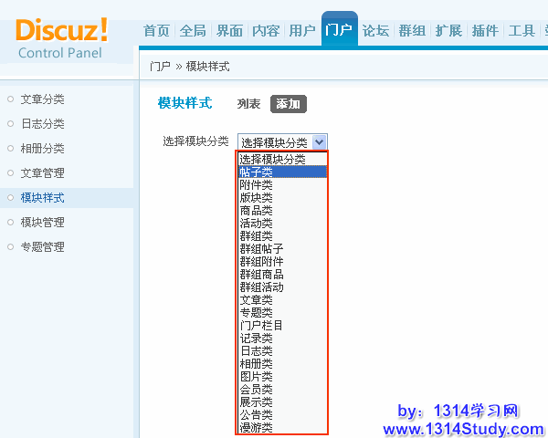 1)后台 => 门户 => 模块样式,点击添加,在下拉菜单中选择要增加的模块样式的类别,如下图所示: