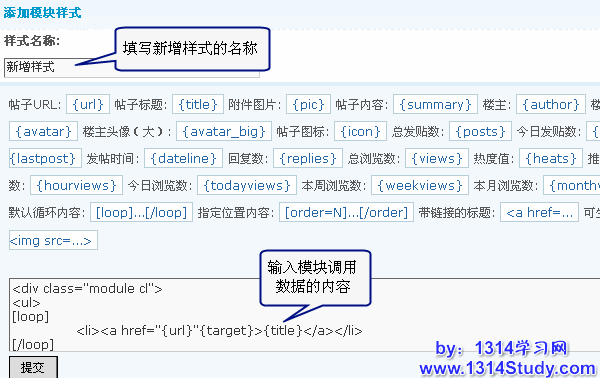 2)在样式名称处填写新增样式的名称,在下面的文本框中输入模块调用的内容,点击提交即可,如下图所示: