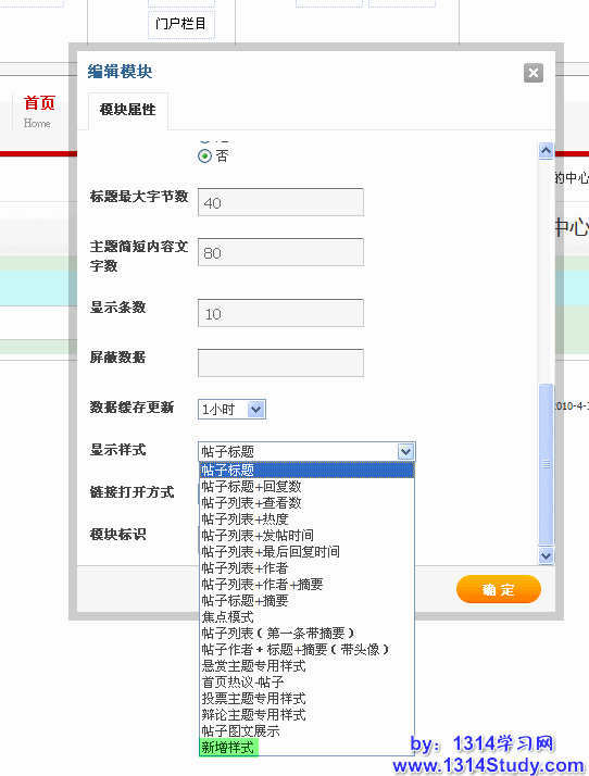 4)在前台 DIY 时,插入模块的时候,模块的显示样式下拉菜单中可以选择新增样式了,如下图所示:
