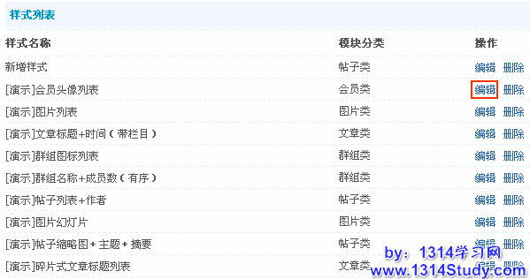 后台 => 门户 => 模块样式 => 列表,点击要修改的模块样式后面对应的编辑,修改模块样式名称或者模块数据调用内容,如下图所示: