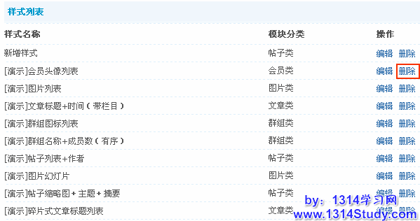 后台 => 门户 => 模块样式 => 列表,点击要删除的模块样式后面对应的删除,即可删除此模块样式,如下图所示: