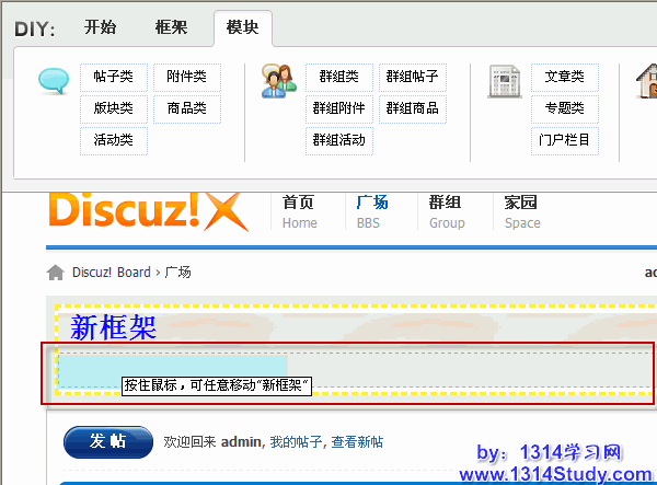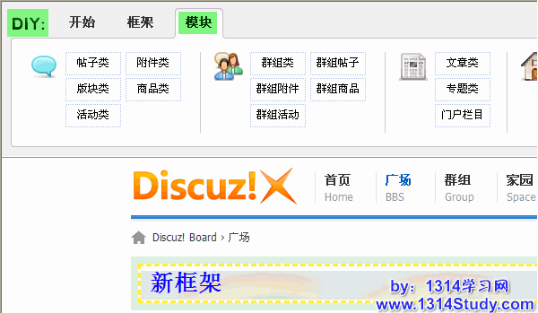 1、打开广场 DIY 页面,点击模块,如下图所示: