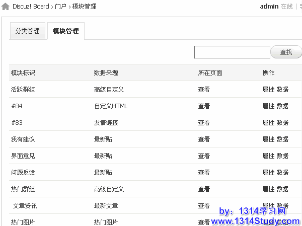 这里需要注意的是,模块管理权限需要在后台进行开启,具体位置在:Discuz! X管理后台 => 用户 => 用户组或者管理组里,找到要开启这个权限的用户组,编辑权限,门户管理权限,允许管理文章:选择“是”、允许创建专题:选择“是”、允许管理专题:选择“是”、允许DIY选择“是”即可。