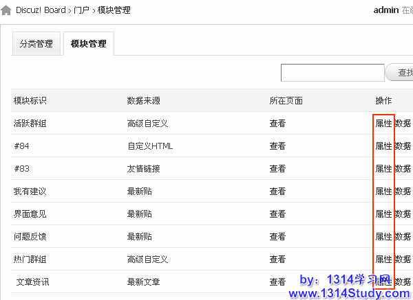 可以点击模块后面的属性,修改模块的属性和数据,如下图所示: