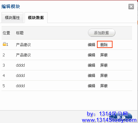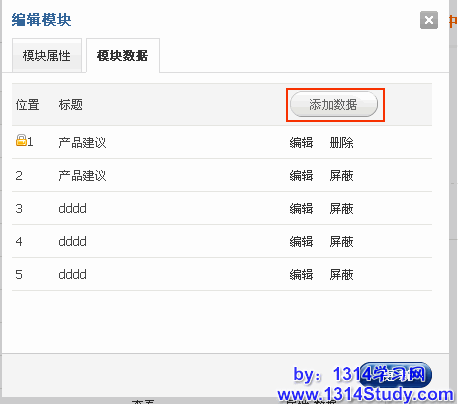 可以点击模块后面的数据,添加和编辑模块的数据,如下图所示: