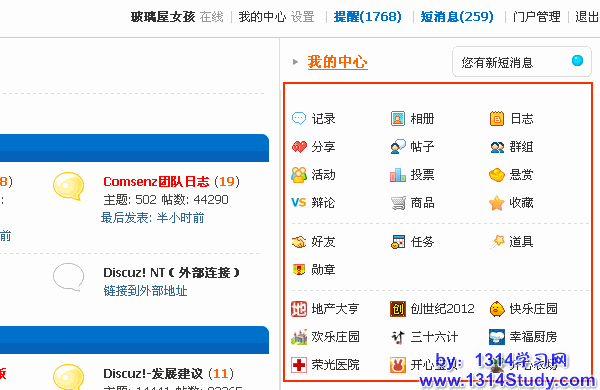 Discuz! X1版本通过我的中心,可以快捷方便进行操作,如发表日志不要进入空间中进行发布,在首页我的中心就可以快速的发布,我的中心是用户的中心,这里包括了与用户相关的大部分信息和设置,其中有记录、相册、日志、分享、帖子、群组、活动、投票、悬赏、辩论、商品、收藏、好友、任务、道具、勋章以及漫游应用等信息。
