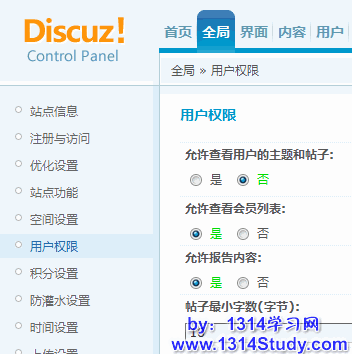 Discuz! X1 后台 => 全局里的用户权限设置是对所有用户的全局设置。