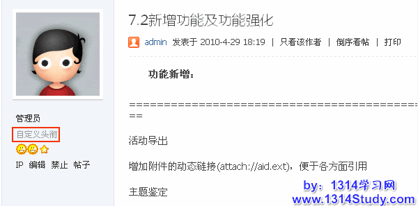 自定义头衔:自定义头衔需要在后台设置相应的权限才可以,自定义头衔填好后会显示在广场里帖子中用户头像的下方,如下图所示:
