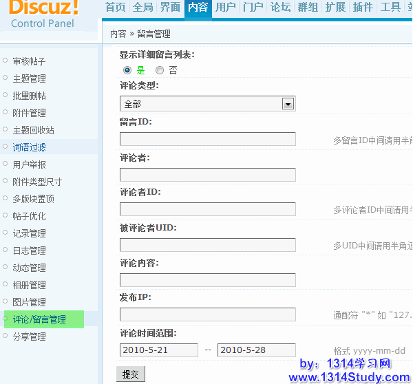 Discuz! X1 中的评论/留言管理功能用于批量删除评论/留言使用。