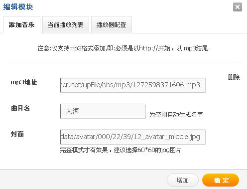 注意:仅支持 mp3 格式添加,即:必须是以http://开始,以.mp3结尾。