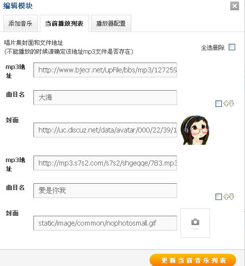 这里可以删除音乐,以及调整音乐的播放前后顺序,同时也可以批量删除音乐。