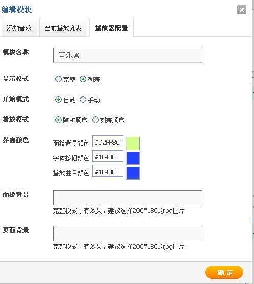 开始模式:分为自动和手动,如果选择手机,那么播放音乐需要手动点击才能开始播放,默认为自动播放,即访问主页的时候会自动播放列表中的音乐。