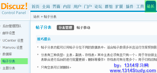 点击每个帖子分表后面的“删除”可以删除该分表,只有空表可以被删除。当主表被删除后,列表中的最后一个分表会自动成为主表。