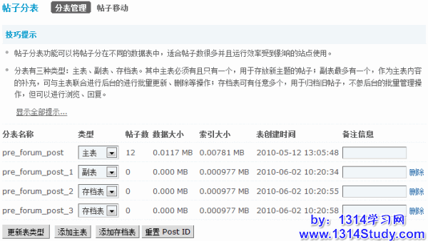帖子的分表有三种类型:主表、副表、存档表。其中主表必须有且只有一个,用于存放新主题的帖子;副表最多有一个,作为主表内容的补充,可与主表联合进行后台的进行批量更新、删除等操作;存档表可有任意多个,用于归档旧帖子,不参与后台的批量管理操作,但可以进行浏览、回复。