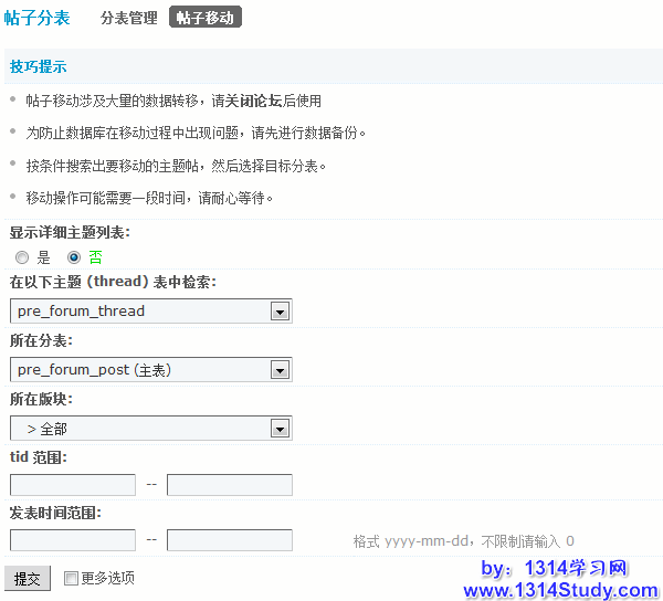 使用“帖子移动”功能可以在各个分表之间移动帖子。帖子移动涉及大量的数据转移,需要关闭论坛后使用。为防止数据库在移动过程中出现问题,请先进行数据备份。