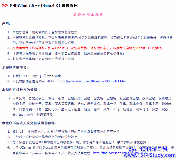 本程序只适用于 Phpwind 7.5 版本的程序。转换程序前请认真阅读转换程序中的转换说明。