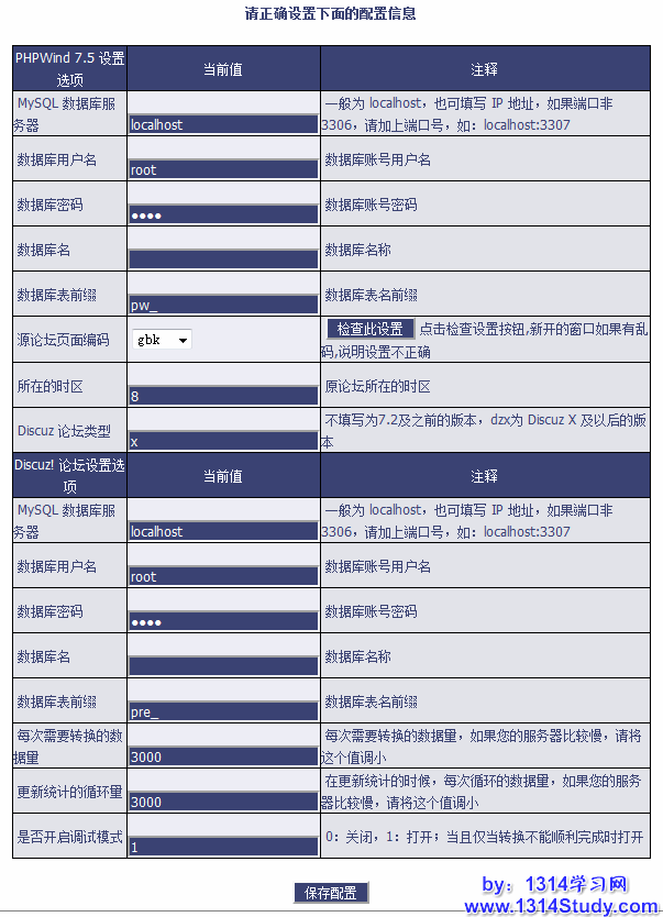 1)、phpwind 数据库字符集:有 GBK、UTF8、BIG5 三种,如果不知道网站的数据库字符集,选择其中的一种,点击右方的“检查此设置”,程序会提取的 pw 的部分数据转换做个测试,如果显示正常说明数据库字符集正确,否则重新设置并检测。
