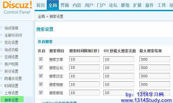 Discuz! X1 中可以分别按文章、论坛、日志、相册、群组的范围进行搜索,站长可以根据站点自身的需要,分别启用所需的搜索,并可对各个范围内的搜索时间间隔、60秒内最大搜索次数、最大搜索结果显示条数进行分别限制。