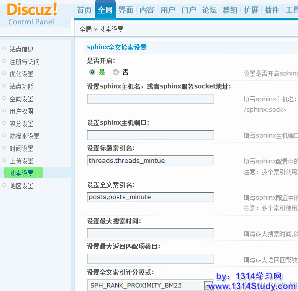 设置方法:管理中心 => 全局 => 搜索设置 => sphinx全文检索设置