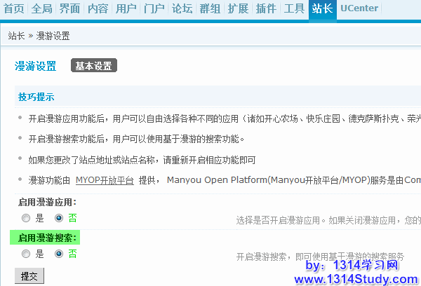 在 管理中心 => 站长 => Manyou 设置 中,选择启用漫游搜索,即可使用基于漫游的搜索服务。