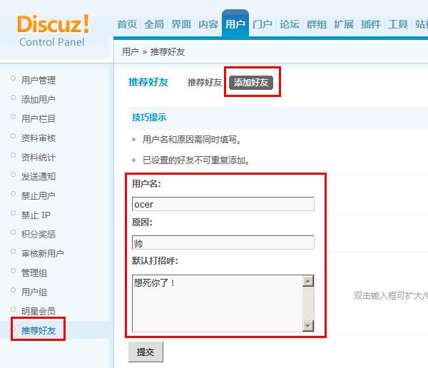登录Discuz! X1 后台 => 用户 => 推荐好友 =>添加好友