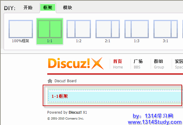 1、在首页添加一个任意类型的框架,例如 1:1 框架,如下图所示: