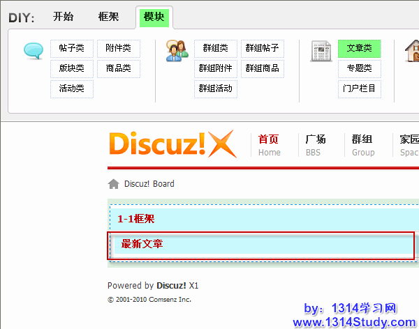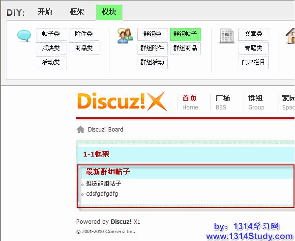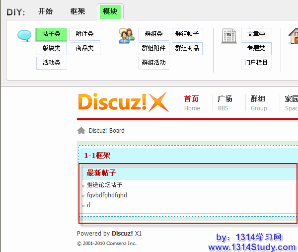 1、在框架中添加一个群组帖子类模块,如下图所示:
