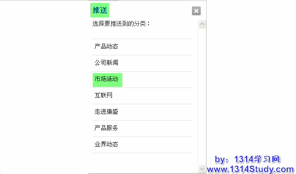 4、在弹出的推送对话框中,选择帖子要推送到的,文章分类,如市场活动,如下图所示: