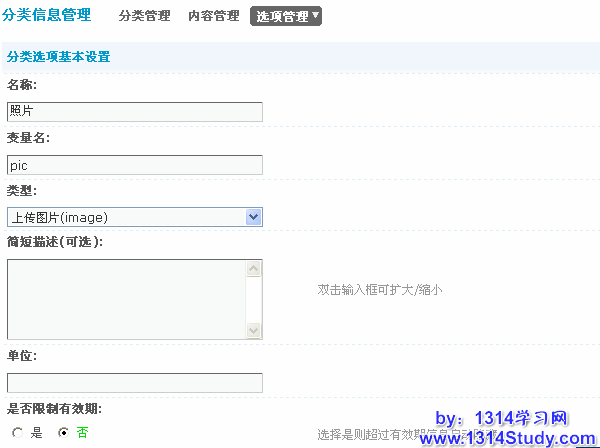 是否设置有效期:此分类信息是否有有效期限制,过期后将不参与分类信息搜索,此有效期在前台发帖时选择。